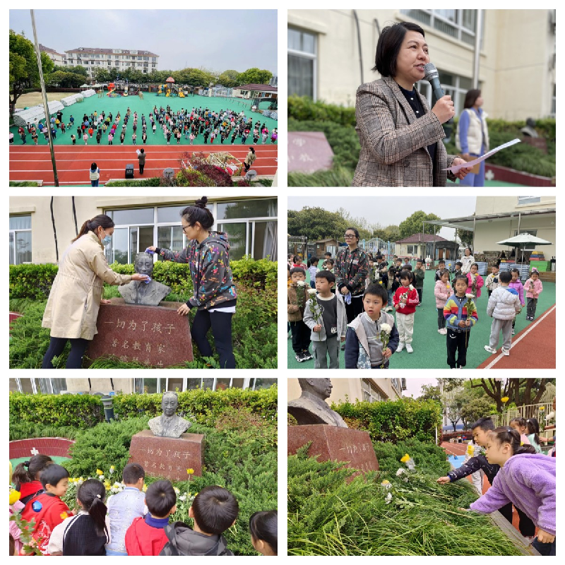 4月6日下午,我园作为陈鹤琴教育思想研究基地园,举行了全园性一年一度“向陈爷爷献花”纪念活动,全园师生集中操场,由傅老师主持本次活动。 首先,傅老师告诉孩子们清明节既是节气又是节日,讲述自己知道的清明习俗,并与孩子们积极互动,丰富对清明节的认知。然后,园长张老师向孩子们介绍了陈鹤琴爷爷的生平,孩子们知道了陈爷爷是我国伟大的教育家,也是一位非常热爱儿童的好老师,他撰写了很多书籍,还创办了南京鼓楼幼稚园等。最后,在庄严肃穆的气氛中,教师代表认真擦拭了校园内陈爷爷雕像,随后带领全体师生向陈爷爷的雕像三鞠躬,并由大班全体教师和幼儿代表全园师生向陈爷爷的雕像献上鲜花,表达感恩和缅怀之情。